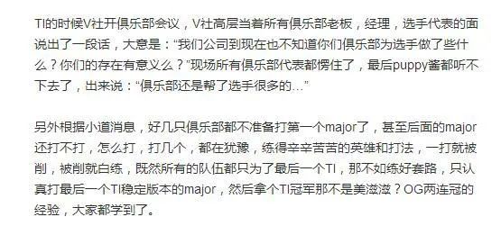 这主要源于其游戏开发商Valve的干预。此前,有著名刀塔博主海涛爆料,称TI时V社召开了俱乐部会议,G胖(Valve创始人)在会议上当着各位老板和选手的面把俱乐部痛批一顿。