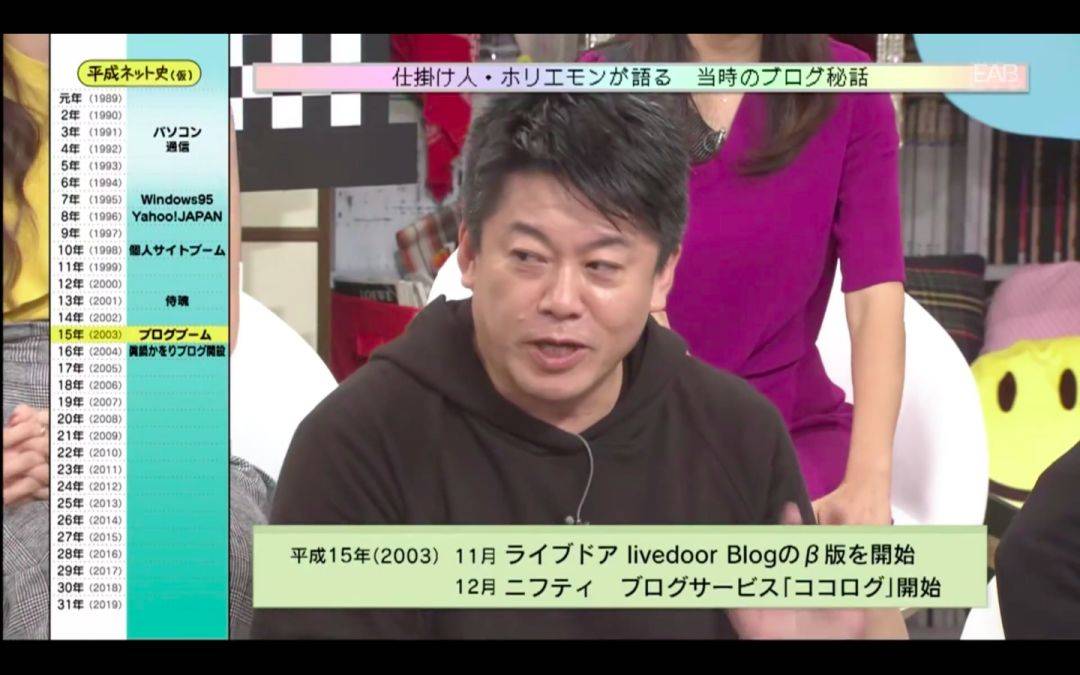 堀江贵文也回忆说,由于个性化的文字网站越来越多,出现了很多有意思的网站,当时的IT企业其实都在想怎么把这些东西聚集起来,正好在2003年liverdoor blog和nifty都开始了博客的运营。