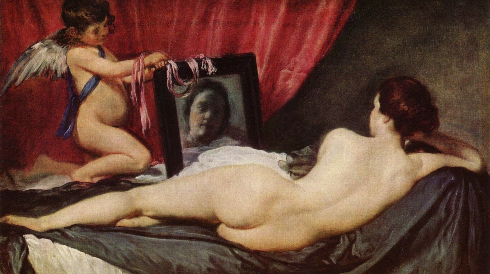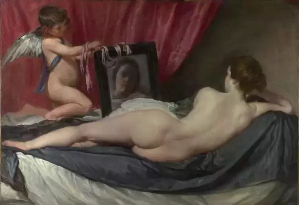 这是17世纪中叶的名画《镜中的维纳斯》(Rokeby Venus),女神背后的凹陷清晰可见