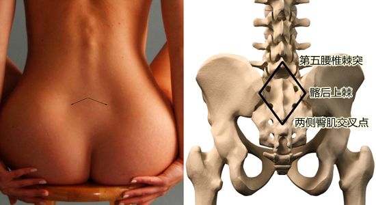 它包括了第五腰椎和整个骶骨,两侧的顶点就是两个腰窝所在的位置。拉伸背部,譬如身体向前倾、向上伸展或者跪姿的时候,肌肉和其他软组织得到拉伸,女性背后的米氏菱形窝更容易显露出来。