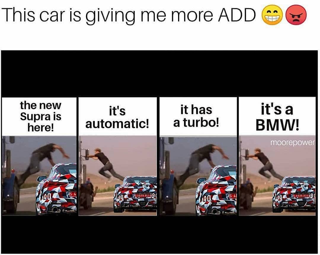2016 年丰田终于定下决心,宣布新 Supra 的研发计划——这次的合作对象竟是宝马。车圈舆论顿时炸了锅,于是便有了这么一张图: