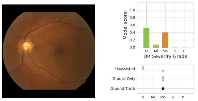 左侧为视网膜眼底图像,眼科工程师会诊小组(真实背景)将其评定为具有中度糖尿病视网膜病变(「Mo」)。右上方为来自模型的预测得分(「N」为无视网膜病变,「Mi」为早期视网膜病变,「Mo」为中度视网膜病变)。右下方则为医生在未参考模型结果(「Unassisted」,无辅助)与参考模型预测分数(「Grades Only」,仅参考分数)后的诊断结论