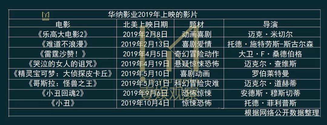 华纳在2019年推出了《哥斯拉:怪兽之王》《乐高大电影2》《小丑回魂2》等头部影片。《哥斯拉》真人动画电影也将推出《精灵宝可梦:大侦探皮卡丘》,而在DC作品里也全新的推出《雷霆沙赞!》。