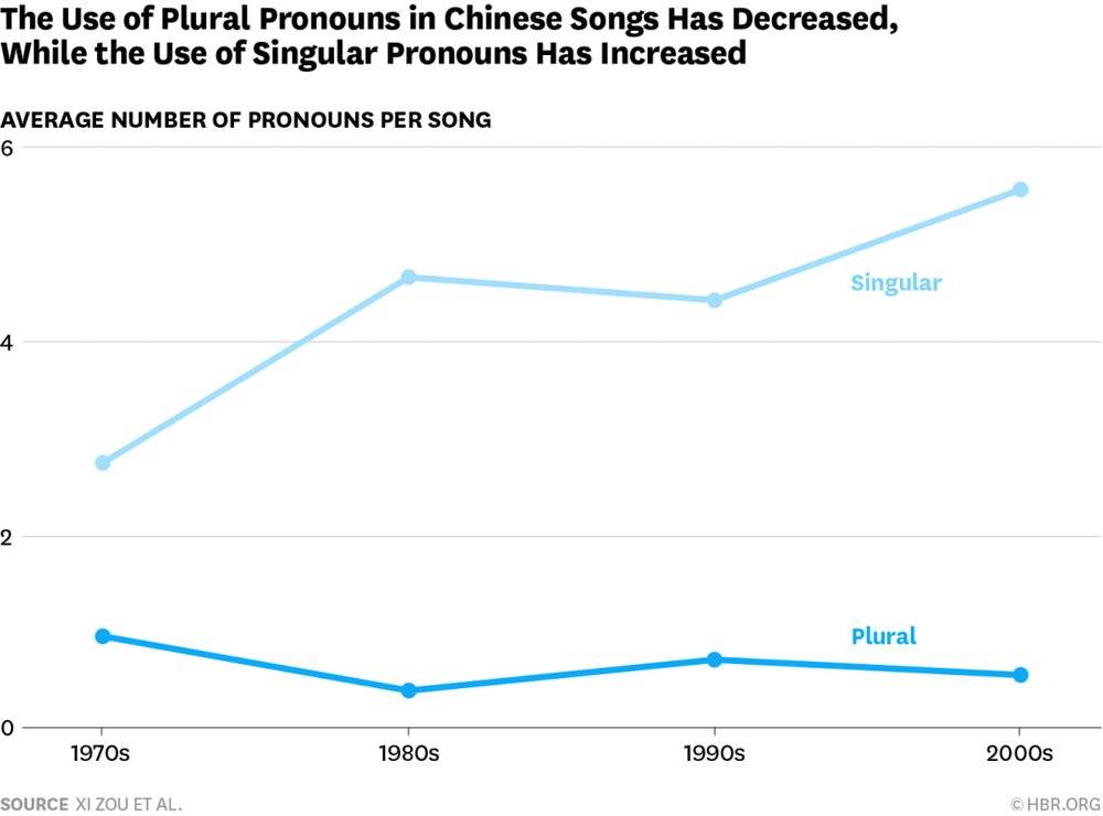 一篇讨论中国个人主义研究指出,70年代后,中国歌曲中的人称单数(我、你、他、她)的使用频率持续上升,远远超过了复数(我们、你们、他们等)