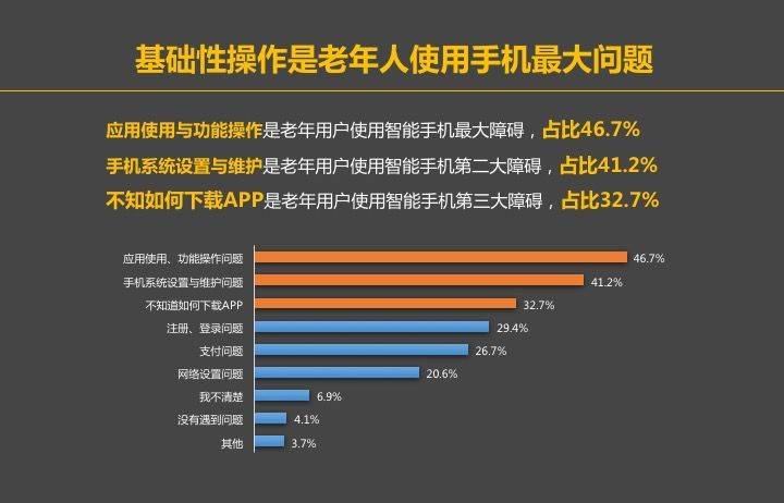 据《老年用户移动互联网报告》指出,使用互联网的老人仅占老年群体中的20%,老年人普遍对智能手机感到“有障碍”。