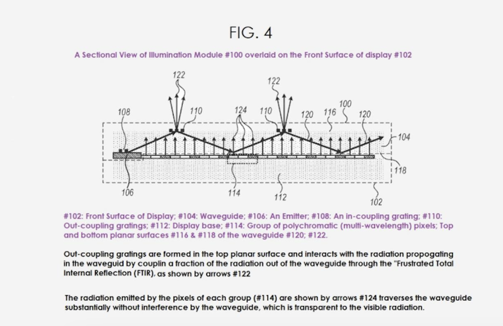 针对这一点,苹果在专利中用“集成+隐藏”的方法,来尽可能地缩小对屏幕分辨率的影响。