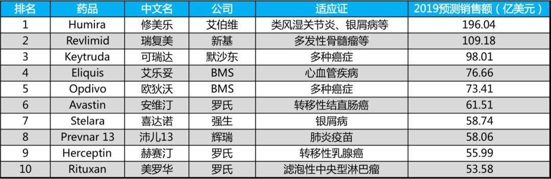 新基制药的瑞复美(Revlimid)仍旧排名第二,预计2019年销售额109亿美元。瑞复美通用名为来那度胺,广泛应用于多发性骨髓瘤、淋巴瘤等等。