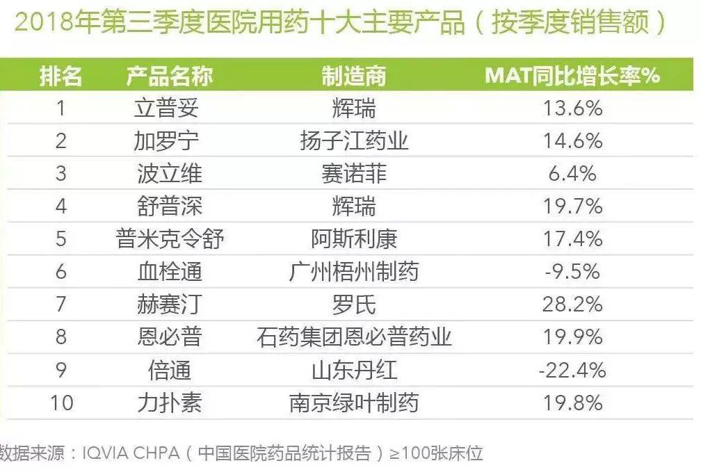 医药产业信息咨询公司IQVIA每个季度都会发布《中国医院医药市场回顾》,其中包括医院药品统计报告,按销售额列出医院用药十大主要产品,八点健闻比较了2018年前三个季度和2017年全年的数据,差别也很小,就用跨度更长的2017年全年榜单做一个比较分析。