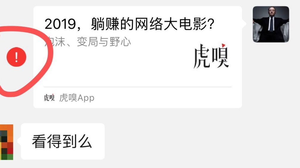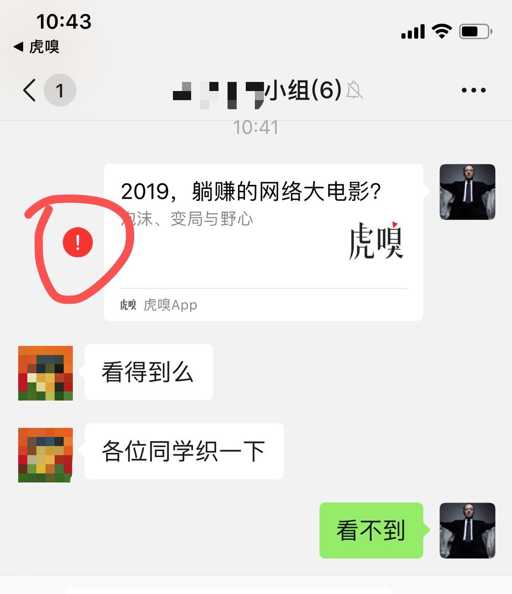 10 : 30的时候,当我把方可成写的一篇《我为什么要写<搜索引擎百度已死>》分享到虎嗅编辑群,显示无法发送成功,当时我以为是这篇文章敏感,后来又从虎嗅APP上分享了一个文章链接到群里,依然是红色感叹号。