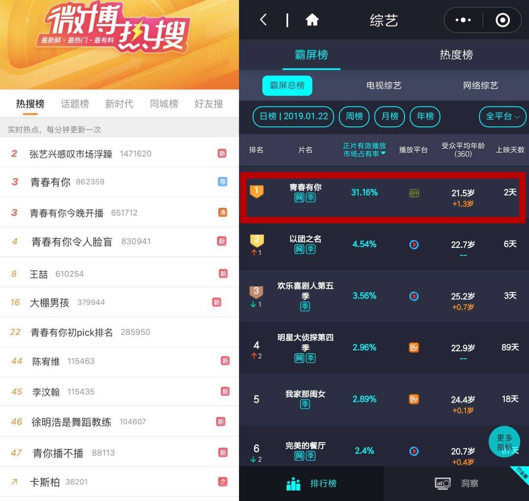 云合数据显示,《以团之名》在播出次日便登顶综艺霸屏榜,正片有效播放市场占有率达到10.89%;截至1月22日,《青春有你》在48小时内正片有效播放市场占有率达到31.16%,并直接挂上了12个微博热搜;《创造营2019》未播便流出网传选手名单,其中《明日之子》第四名周震南、X玖少年团成员赵磊等也引起广泛讨论。