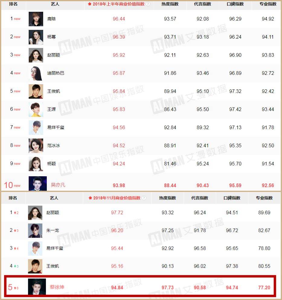 蔡徐坤在11月就已经跃居至艾漫数据2018商业价值排行榜第5名