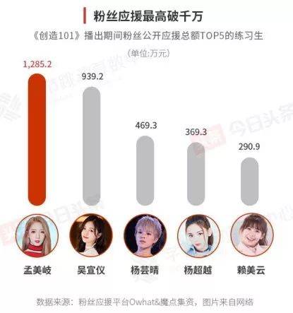 《创造101》播出期间粉丝公开应援总额TOP5的练习生