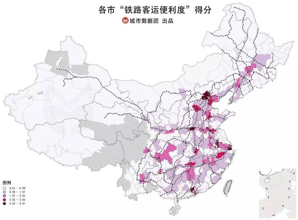 而当我们从抢票的个人角度转移到城市角度,将看到一个重要的影响因素:城市在全国铁路网络中的地位和便利程度。