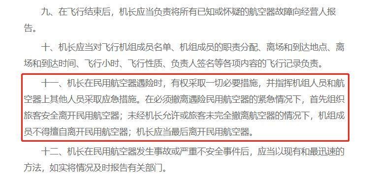除此之外,在驾驶员头顶两侧分别配有逃生绳,用于从驾驶舱撤离使用(迫降以后),完全不见降落伞的影子。 此外,在民航飞行员在所有的训练中,都没有过跳伞训练。也许一些军转民的飞行员会跳伞,但是《民用航空运输机长职责》的第十一条明确规定了,机长应该是最后一个离开航空器的人,谣言不攻自破。