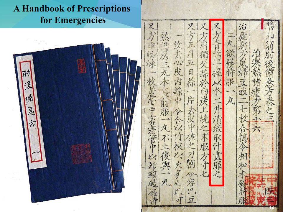 葛洪《肘后备急方》中对青蒿抗疟的记载(摘自屠呦呦的诺贝尔奖演讲)