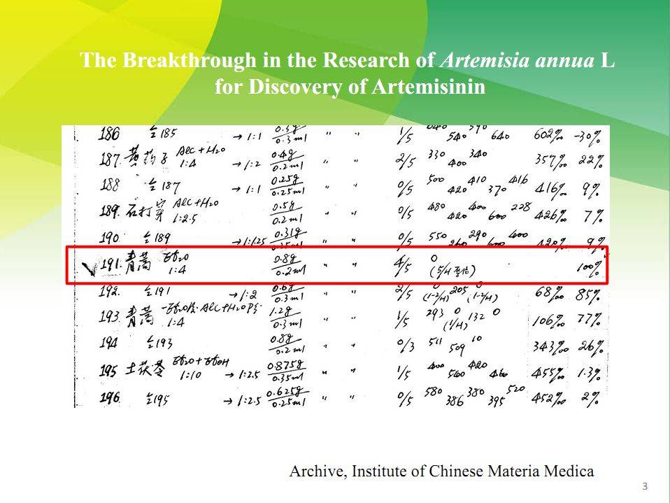 191号样品对疟疾的抑制率达到100%(摘自屠呦呦的诺贝尔奖演讲)