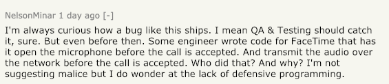 我非常好奇这样的 bug 是怎么就能发布的。(苹果)在 QA&Testing 时就应该发现这个问题。工程师为 FaceTime 功能写代码时应该写道了:“在接受呼叫之前打开麦克风,并在接听电话之前通过网络传输音频。”那么这是谁做的?我不是恶意暗示,但我确实对缺乏防御性编程感到疑惑。