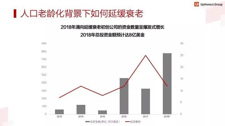 人口老龄化背景下,人们对衰老延缓技术及老年病的治疗(癌症&阿茨海默)关注度提升,反映在2018年涌向延缓衰老初创企业的投资金额爆发。