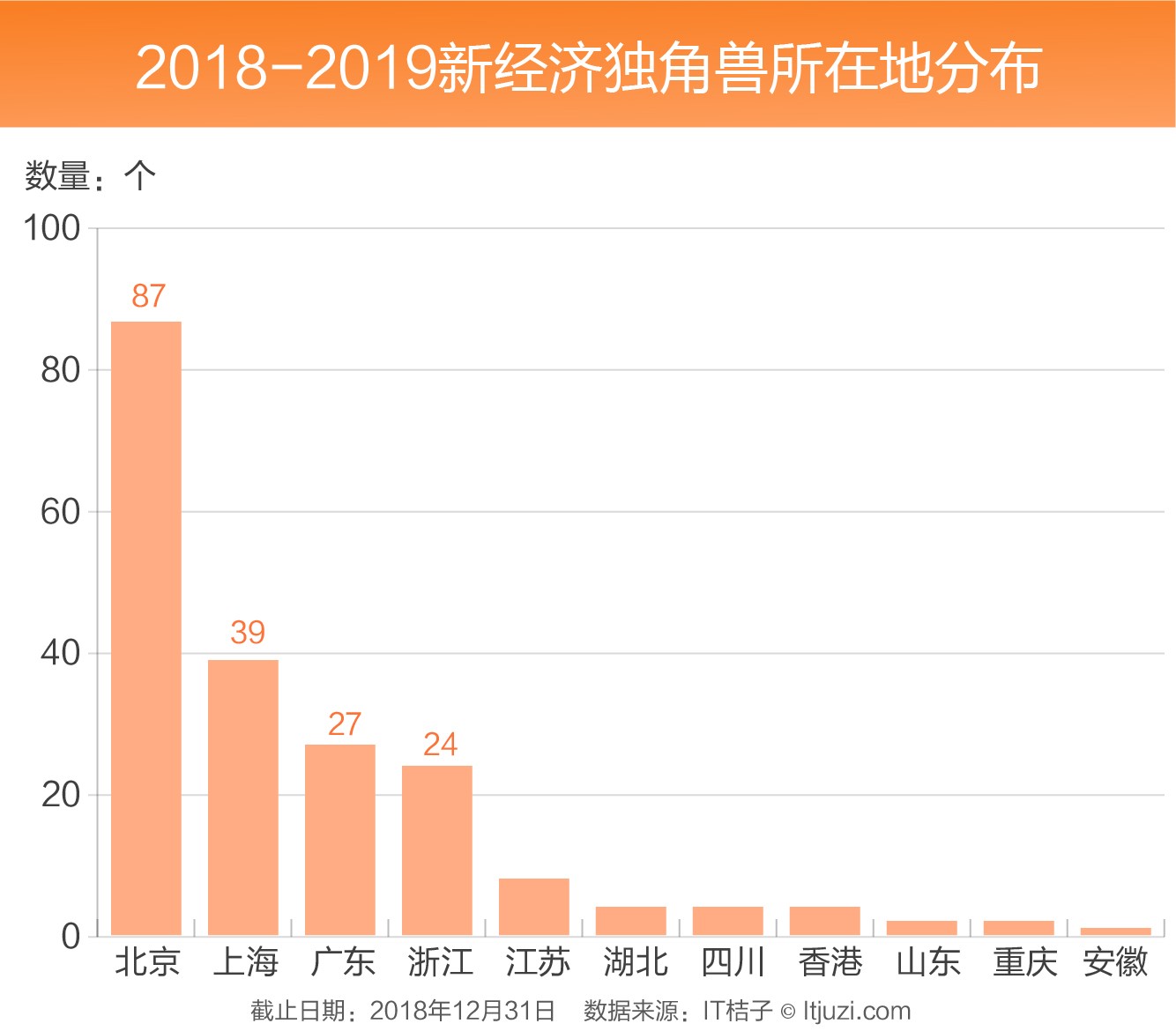 《2018-2019 中国新经济独角兽俱乐部》的 202 家公司从地域上看分布在 11 个省市,其中安徽、山东、重庆等地分别仅有 1~2 家,独角兽公司的分布仍十分集中。有 87 独角兽总部设置在北京、39 家在上海、27 家在广东——北上广集中了 75% 的独角兽,能与北上广各地稍微抗衡一些是以杭州为核心的浙江省。
