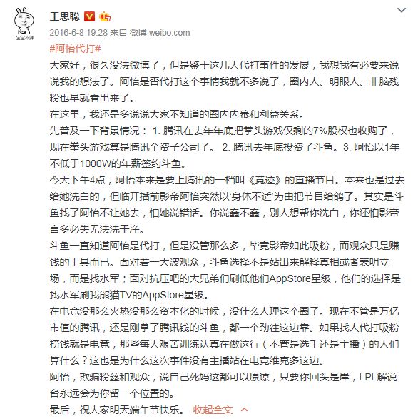 6月,王思聪手撕千万年薪的斗鱼女主播阿怡,称其作弊代打,成为电竞圈甚至直播圈的最大话题。