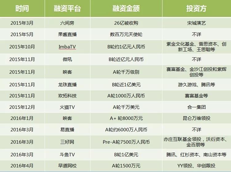 (2015-2016网络直播平台融资一览,图片来自网络)