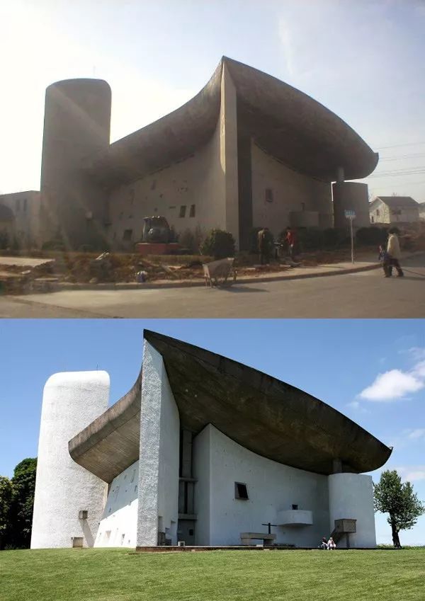 河南某经济技术开发区仿建朗香教堂(上)与法国朗香教堂(下)