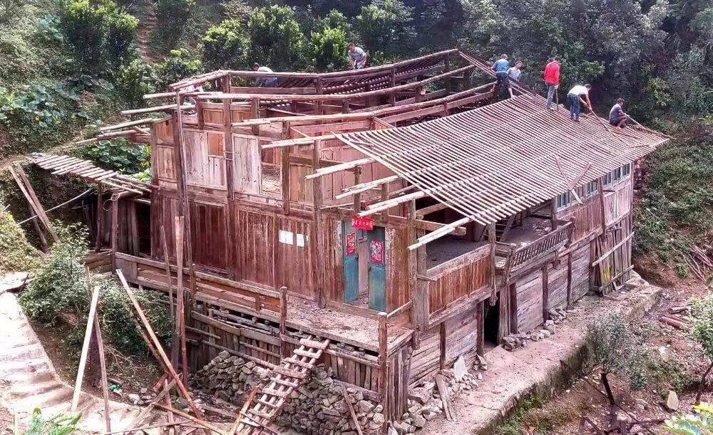 上寨一户人家拆旧房子,盖了新房子,全寨年轻人都来帮忙
