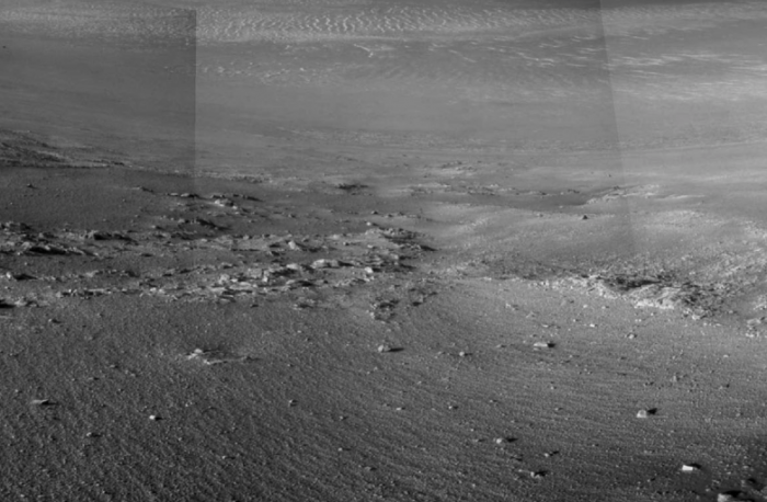 2004 年 1 月 30 日,机遇号在着陆点附近发现了火星曾经有水存在的初步证据。它利用小型热辐射光谱仪发现了可能存在赤铁矿的线索,而这种矿物通常在有液态水的环境下生成。这暗示着火星上从前比现在更“湿润”,适合于生物生存。