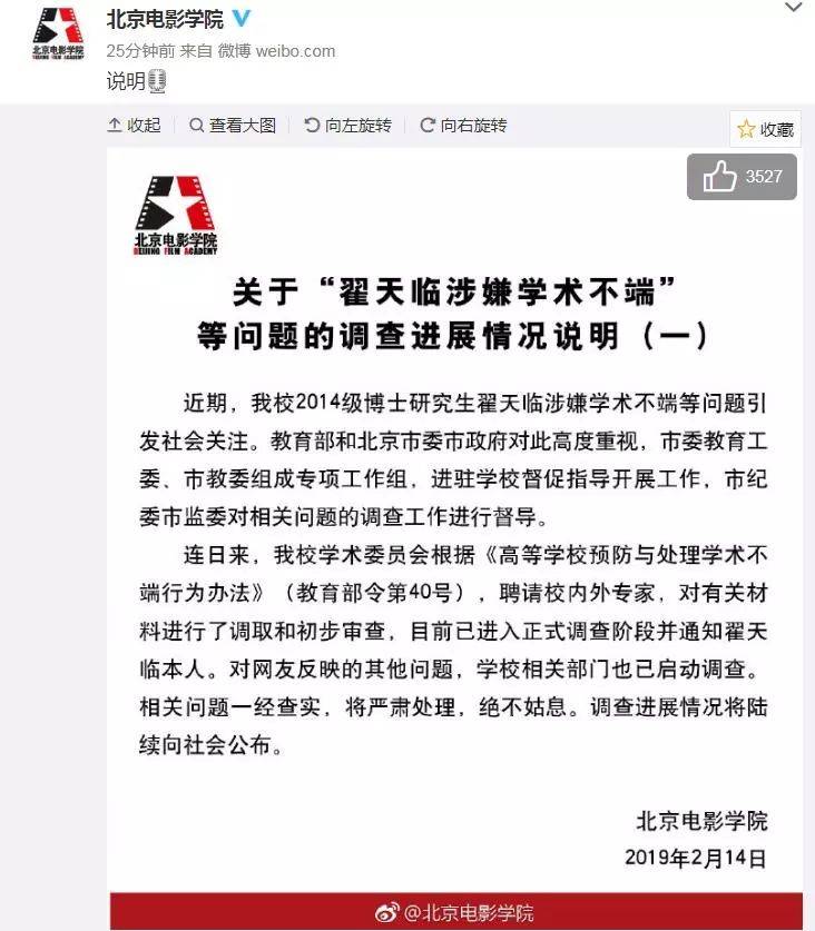 2月11日晚间,翟天临的博士院校北京电影学院称,已经对翟天临论文造假事件成立调查组;2月14日,北电称目前已正式进入调查阶段并通知了翟天临本人。而其博士后院校北京大学光华管理学院也发布声明称,将根据北京电影学院的调查结论按规定做出处理。