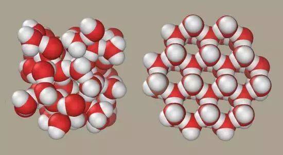 图中的液态水分子显得杂乱而稠密,而右边的冰分子则显得有序而分散