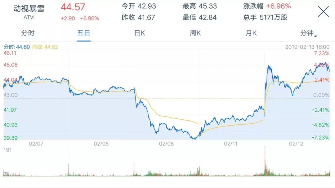 锌刻度记者调查后发现,在周二财报公布前,动视股价受此前的裁员传闻影响大涨近4%,在裁员消息坐实之后,股价先是下跌而后开始回升,截至2月13日,美股收盘价为44.57美元,每股上涨2.9美元,当日最高达45.33美元,涨幅约6.96%。
