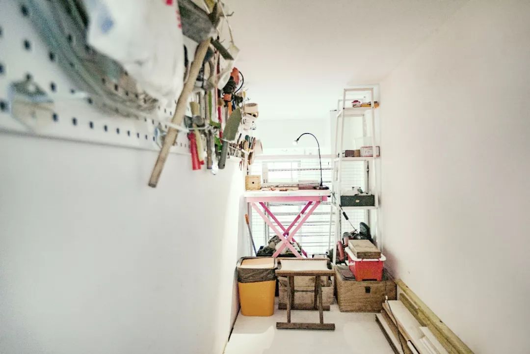 厕所上方的储物间,也是我们“借”出来的空间。我给老公做了一个5㎡的木工区,他可以坐在这里敲敲打打,也不会影响楼下的人。