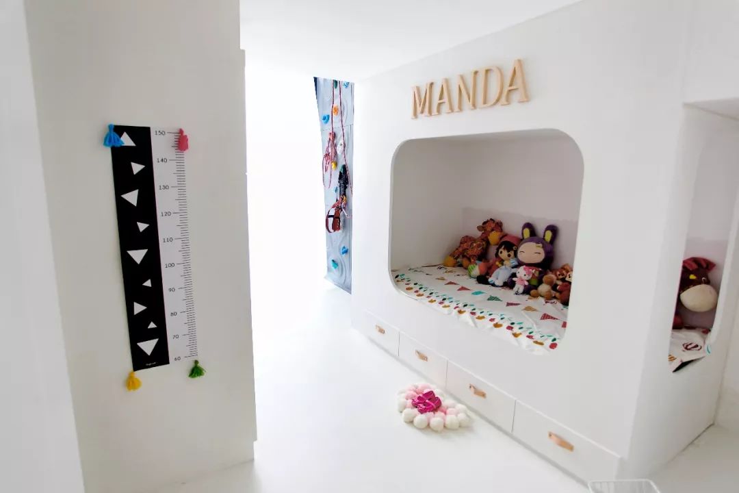 因为我家的层高有3.75米,想利用层高给女儿做一些活动空间,所以利用了北阳台的空间,做了一面攀岩墙。女儿非常喜欢她的儿童房,每次小伙伴来家里玩,她都很自豪。