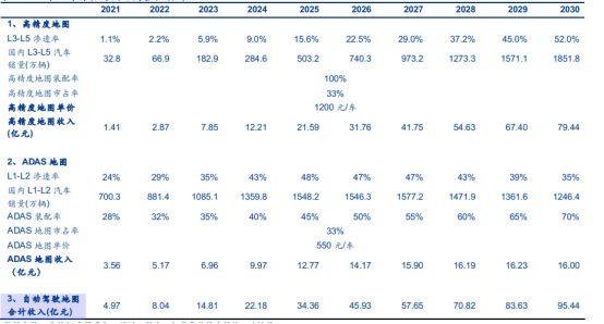(1)高精度地图是高等级自动驾驶L3及以上的必选项,协助辅助感知,确定车辆位置和路径规划是极为重要的能力。自动驾驶的高精度地图目前渗透率极低,未来随着自动驾驶的普及,初装地图的市场规模将获得极大提升。
