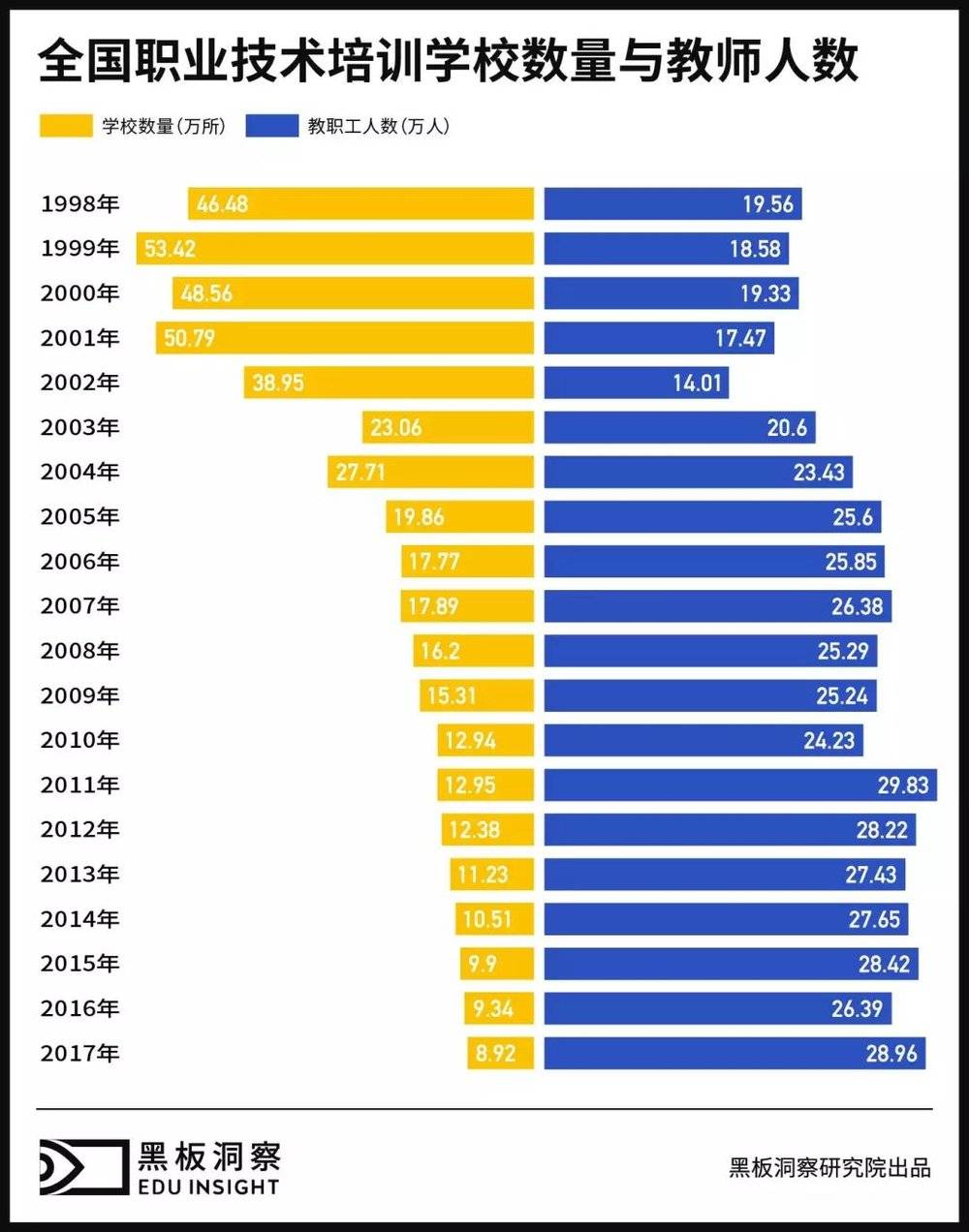 近20年来,成人中初等技术培训教育整体上规模在持续缩小,1998年职业技术培训学校和成人初等学校的数量,分别是46.48万和5.08万所,至2017年,职业技术培训学校数量已降至8.92,而成人初等学校的数量在2011年就降到了1.04。