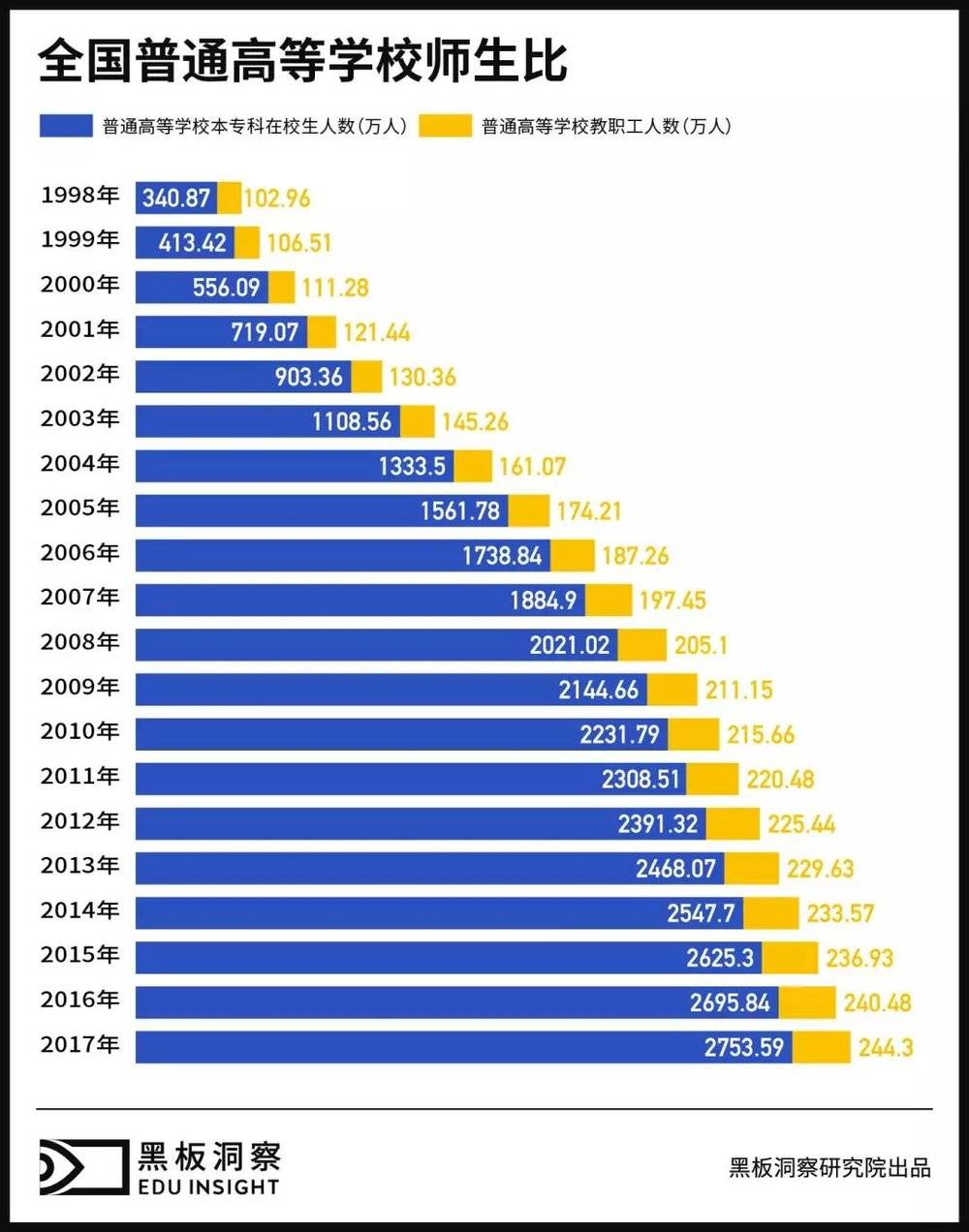 值得注意的是,相比飞速增长的学生数量,高校教职工人才的引进却似乎一直处于相对迟缓状态。1998年,普通高等学校教职工人数为102.96万,2017年增至244.3万,年均增长速度为4.69%,远不及学生。