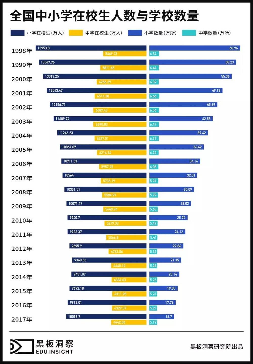1998年全国小学在校生13953.80万人,小学总数60.96万所,全国初中学校数量6.54万所,这是这几项数据近来二十年的峰值。从1998年起,由于计划生育政策逐渐落实,学龄人口的逐年减少,小学初中校数、学生数开始持续减少,但随着义务教育的逐渐普及,学龄儿童的净入学率不断提高。