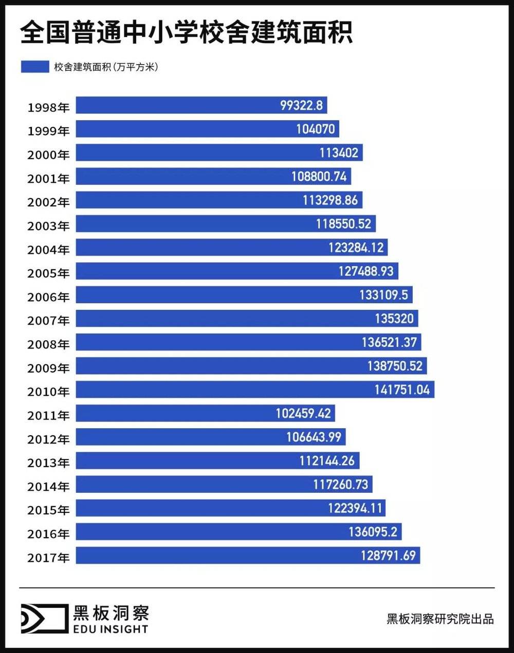全国中小学校舍建筑面积于2010年达到顶峰,为141751.04万平方米,2011年陡然降至102459.42万平方米。但和在校学生人数的数据变化大致同步,随着二胎政策的实施,校舍建筑面积也开始逐步回升,至2017年已经达到136095.2万平方米。