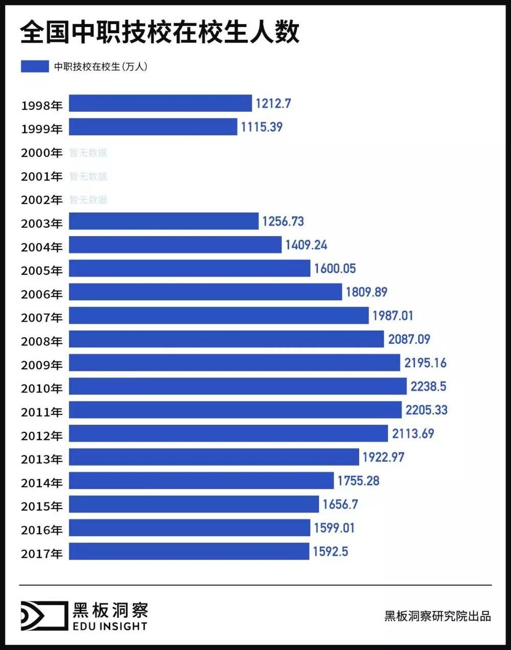 从2007开始,普通高中在校生的数量就开始持续下落,而中职技校学生的数量却有增无减,截至2010年,中职技校在校生数量达到峰值2238.5万。它与高中阶段教育整体的发展基本上同步。