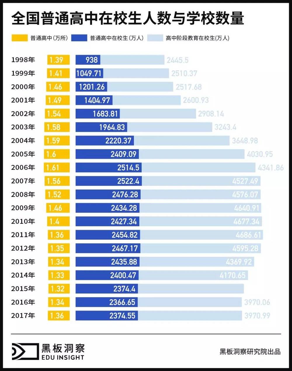 与之形成鲜明对比的是,普通高中在校生的增速明显缓慢,1998年普通高中在校生数量为938万,但在2007年就已达至峰值2522.4万。
