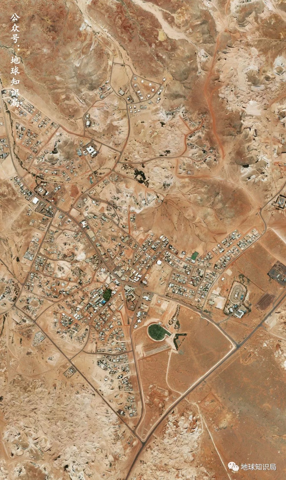 比如在澳大利亚中部的库伯佩蒂镇,从地上看,此处除了沙漠那荒芜、红土丘陵那样酷似月球表面的地面,就是寥寥无几的低矮建筑和当地居民,让人倍感凄凉,甚至会让人有种走错地方的错觉。