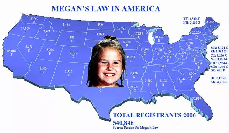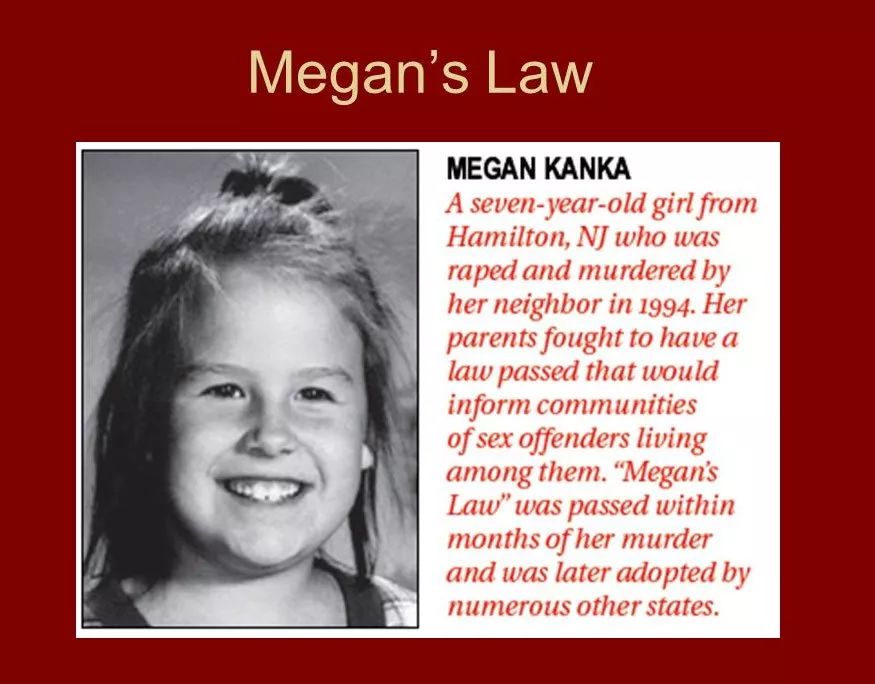 1994年7月,美国新泽西州一名年仅7岁的小女孩梅根·康卡(Megan Kanka)受心怀不轨的邻居邀请去他家看其养的宠物 ,结果被强奸并杀害。原来,此人系恋童癖,之前已经有两次性暴力侵害犯罪记录。梅根的父母认为,如果他们对此人的犯罪前科等资料有所知晓,一定能事先采取恰当的措施保护好孩子。