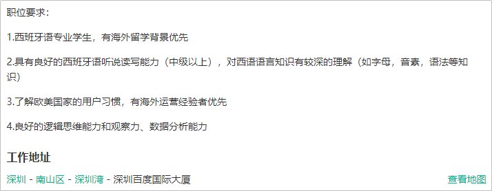 比如,以下为百度招聘海外运营的需求,明确提出西班牙语听说读写的等级,甚至详细到字母、因素、语法等细节。