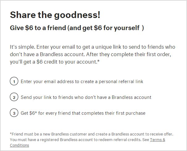 这里再举一个国外的例子,美国一家 1 美元店,它在运营上就极其佛系。比如,在拉新方面,Brandless 只有一招,当用户将产品分享给朋友(必须是 Brandless 的新用户),朋友完成第一次下单购买后,双方都能获得 6 美元的奖励。