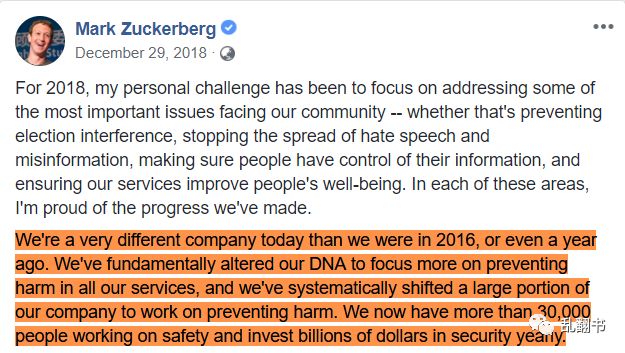 扎克伯格在2018年的最后一条Facebook动态中总结在用户隐私和安全方面的成就,强调”Facebook已经从根本上改变了DNA”: