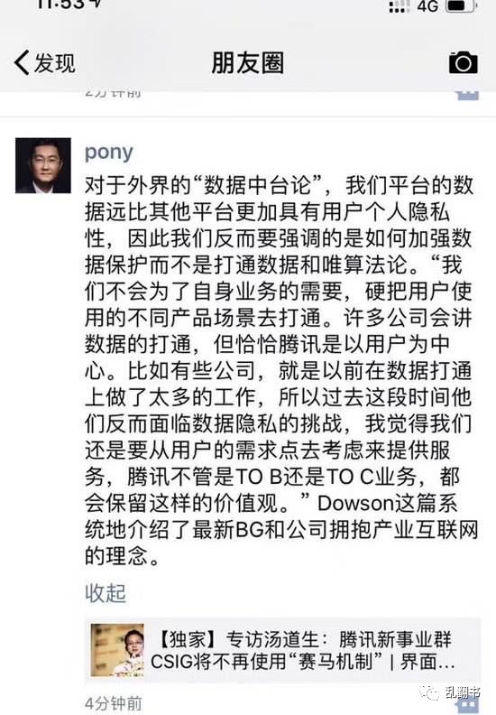 去年腾讯组织架构调整进程中实现了技术打通,而对数据打通保持谨慎态度。马化腾在18年11月的世界互联网大会上回应“数据中台论”: