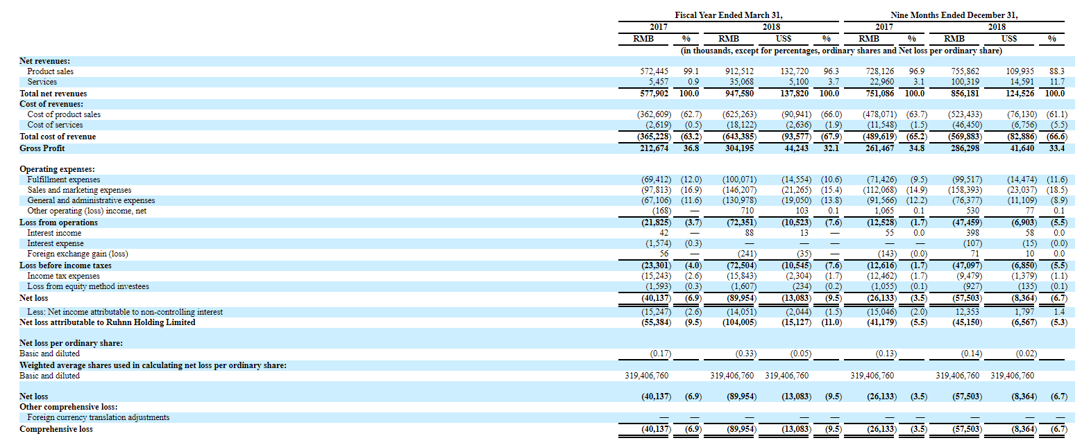 2018财年,如涵总营收成本6.43亿元,毛利3.04亿元;配送费用1亿元,销售与营销费用1.46亿元,总务及管理费用1.3亿元,加上其它营业收入71万元,总运营亏损7235万元。该年净亏损8995万元,归于如涵控股有限公司的净亏损约为1.04亿元。