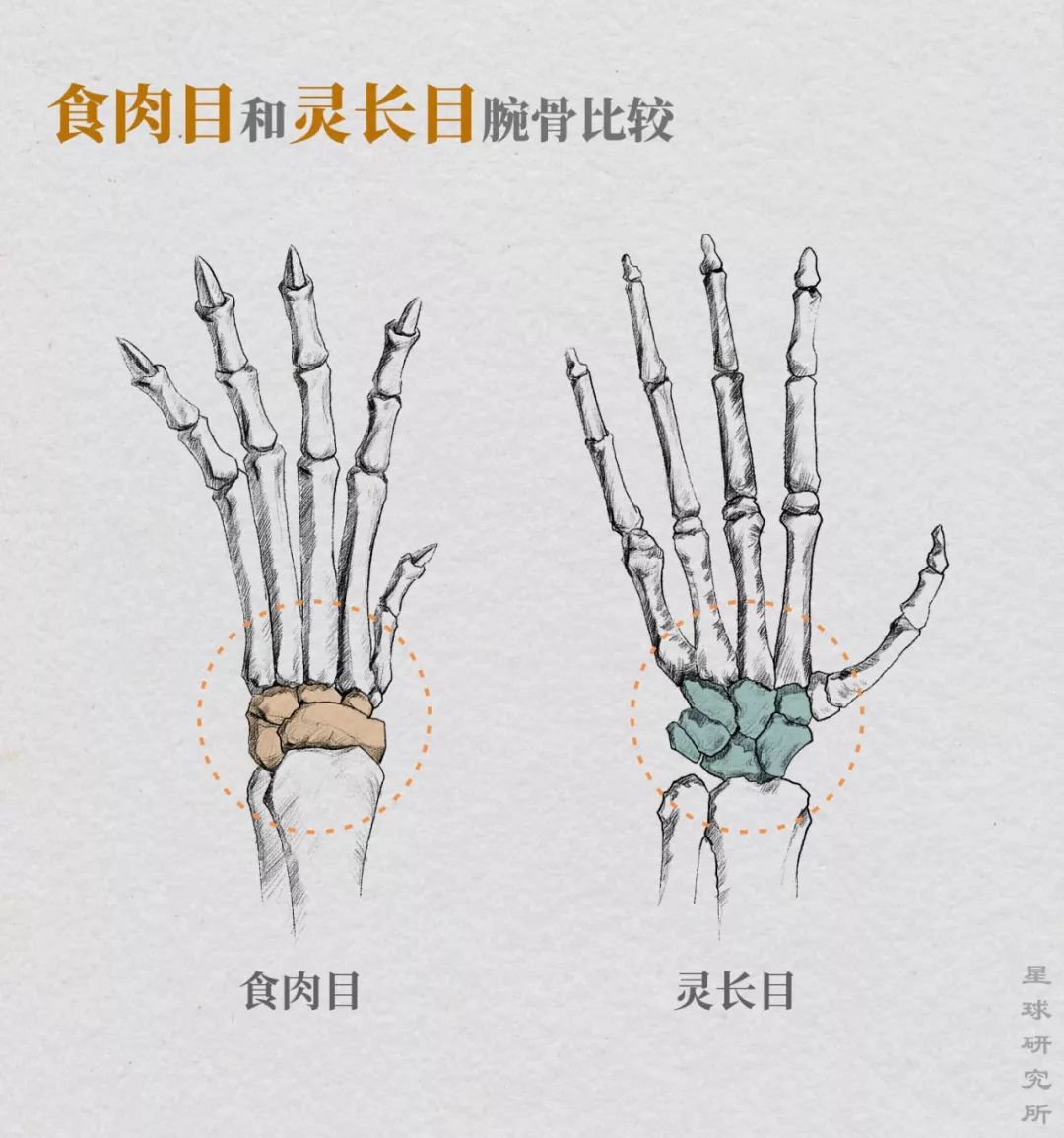 (食肉目和灵长目腕骨比较;稳定性和灵活性似乎永远是一对矛盾,食肉目动物腕骨融合为一整块,提高稳定性的同时丧失了一部分灵活性,而灵长目相反,放弃了稳定性而获得了灵活性,所以人类有着更加灵活的双手,制图@张靖/星球研究所)