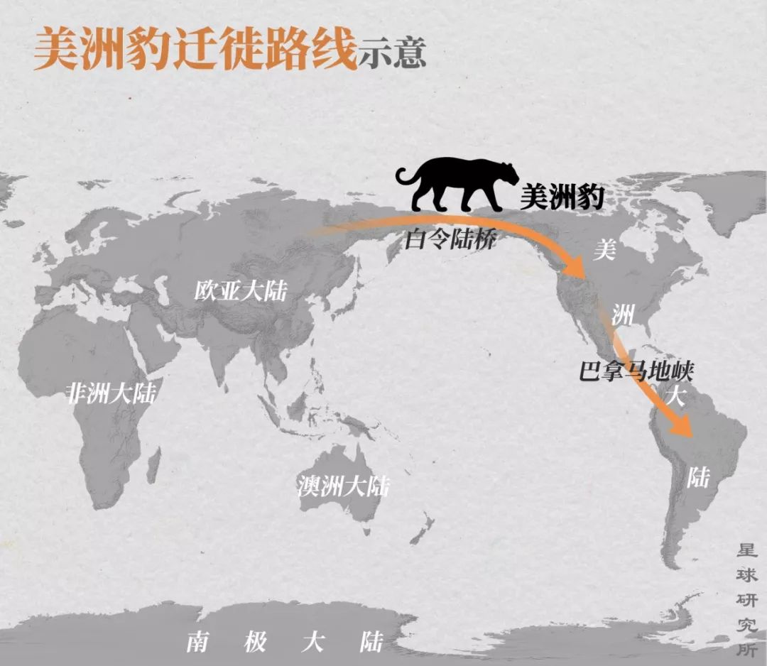 当时北美和欧亚大陆通过白令陆桥相连,南、北美洲之间通过巴拿马地峡相通,现代大猫踏上和剑齿虎一样的迁徙路线,来到美洲。