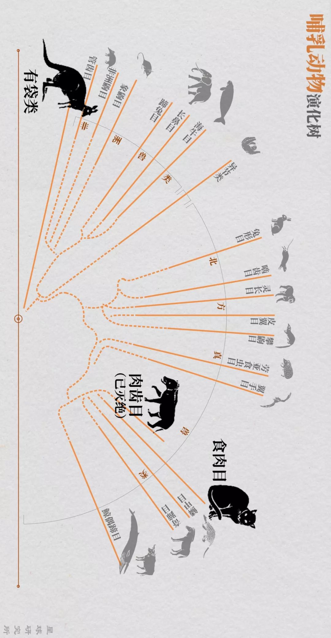 (请将手机横屏观看,哺乳动物演化树,其中食肉目、有袋类和肉齿目均有大型食肉动物,但肉齿目食肉动物和有袋类的大型食肉动物已经灭绝,只有食肉目的大型食肉猛兽存续至今,制图@张靖/星球研究所)